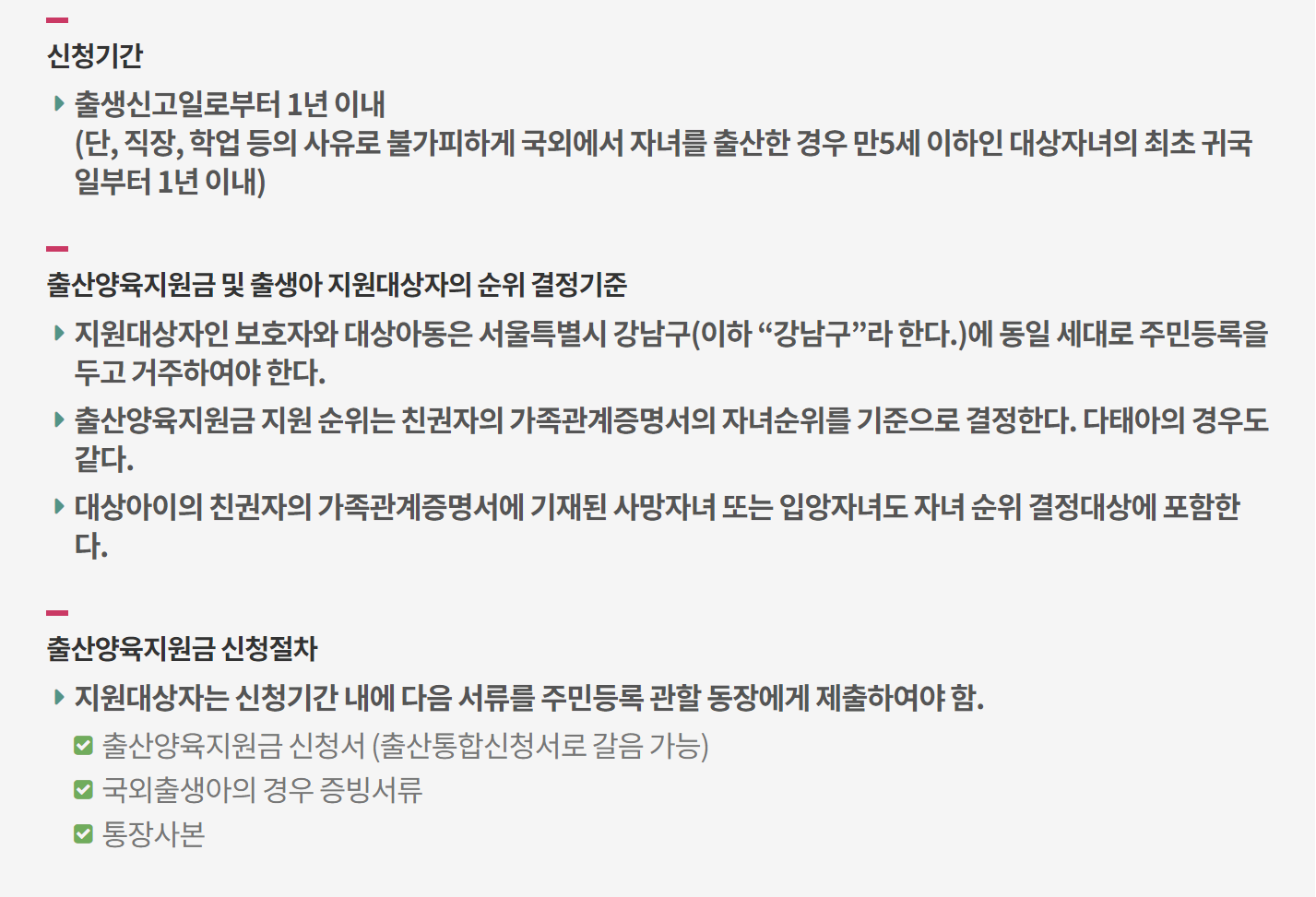 신생아 출생신고일을 기준으로 1년 전부터 신청일 현재까지 강남구에 주민등록을 두고 거주하는 부 또는 모로 하며 대상자녀는 동일 세대원이어야 한다. 매월 15일에 지급되니 첨부서류를 주민센터에 제출하여 꼭 수령하시길 바랍니다.