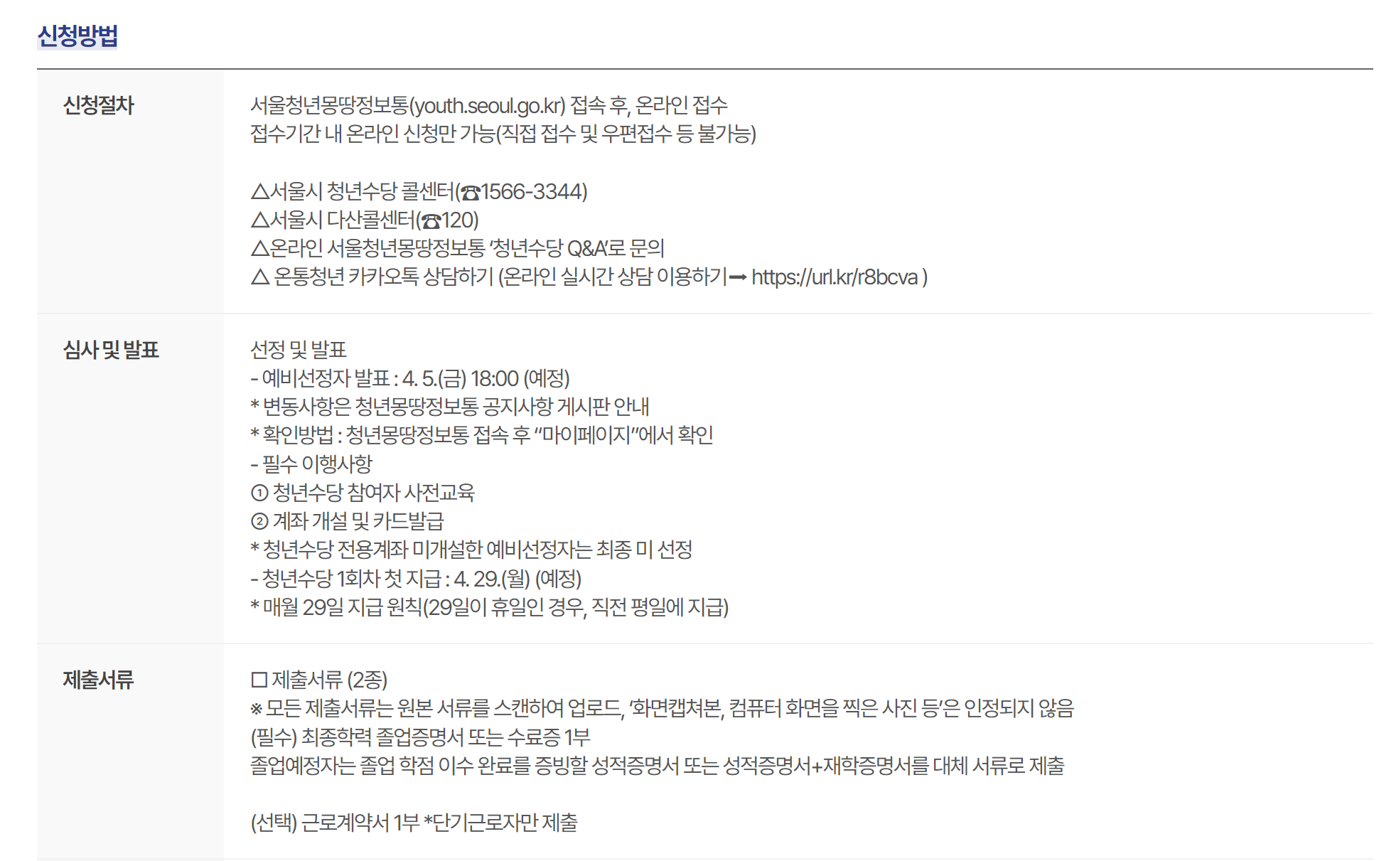 서울시 청년수당 신청방법 신청기간은 2024년 03월 11일 10:00~ 2024년 03월 18일 16:00까지이다.