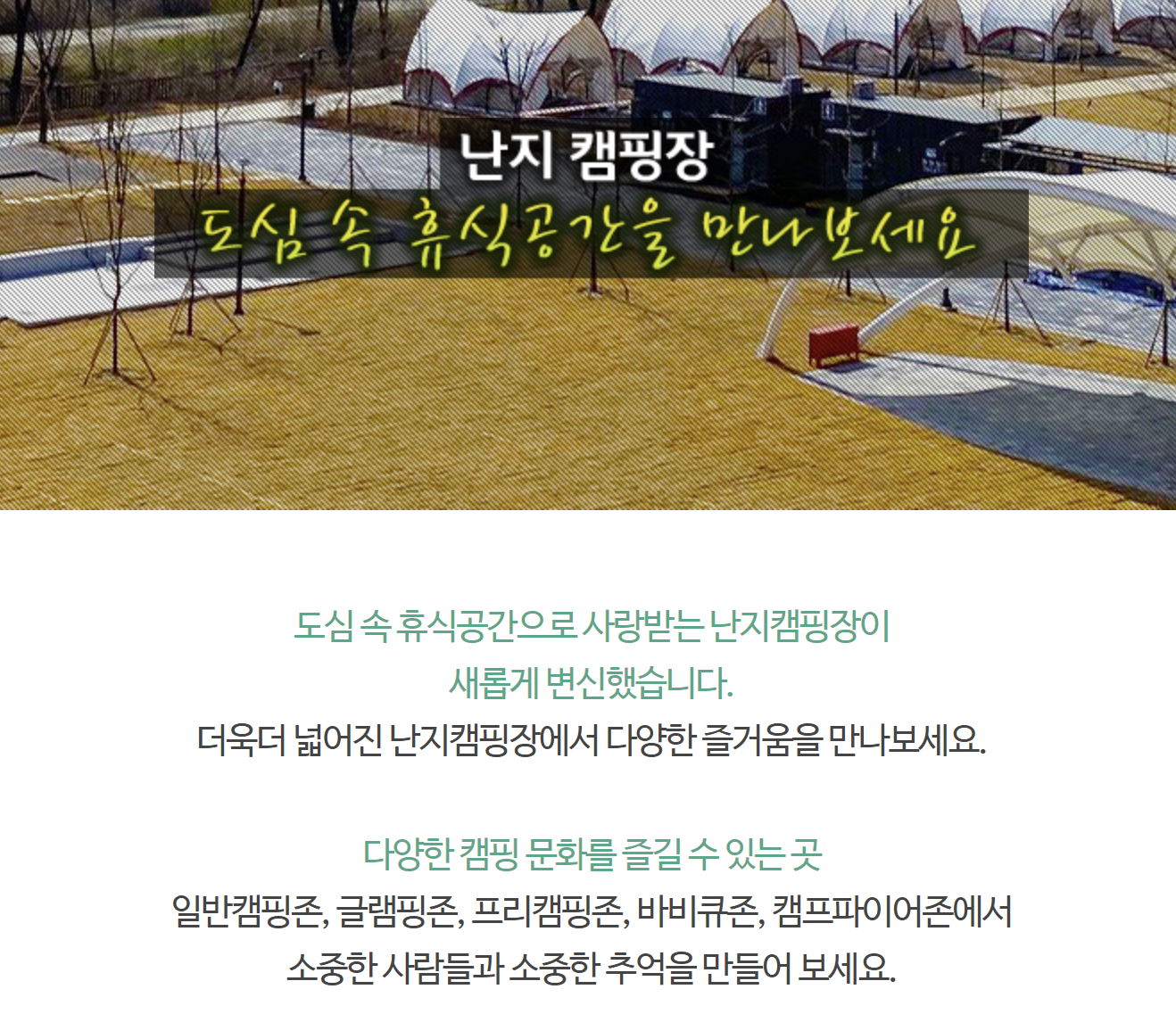 서울에 거주하는 평범한 사람으로써 일상에서 벗어나 단 하루만이라도 가족, 친구, 연인 등과 함께 지낼 수 있는 서울시 난지캠핑장을 알아보고자 한다.