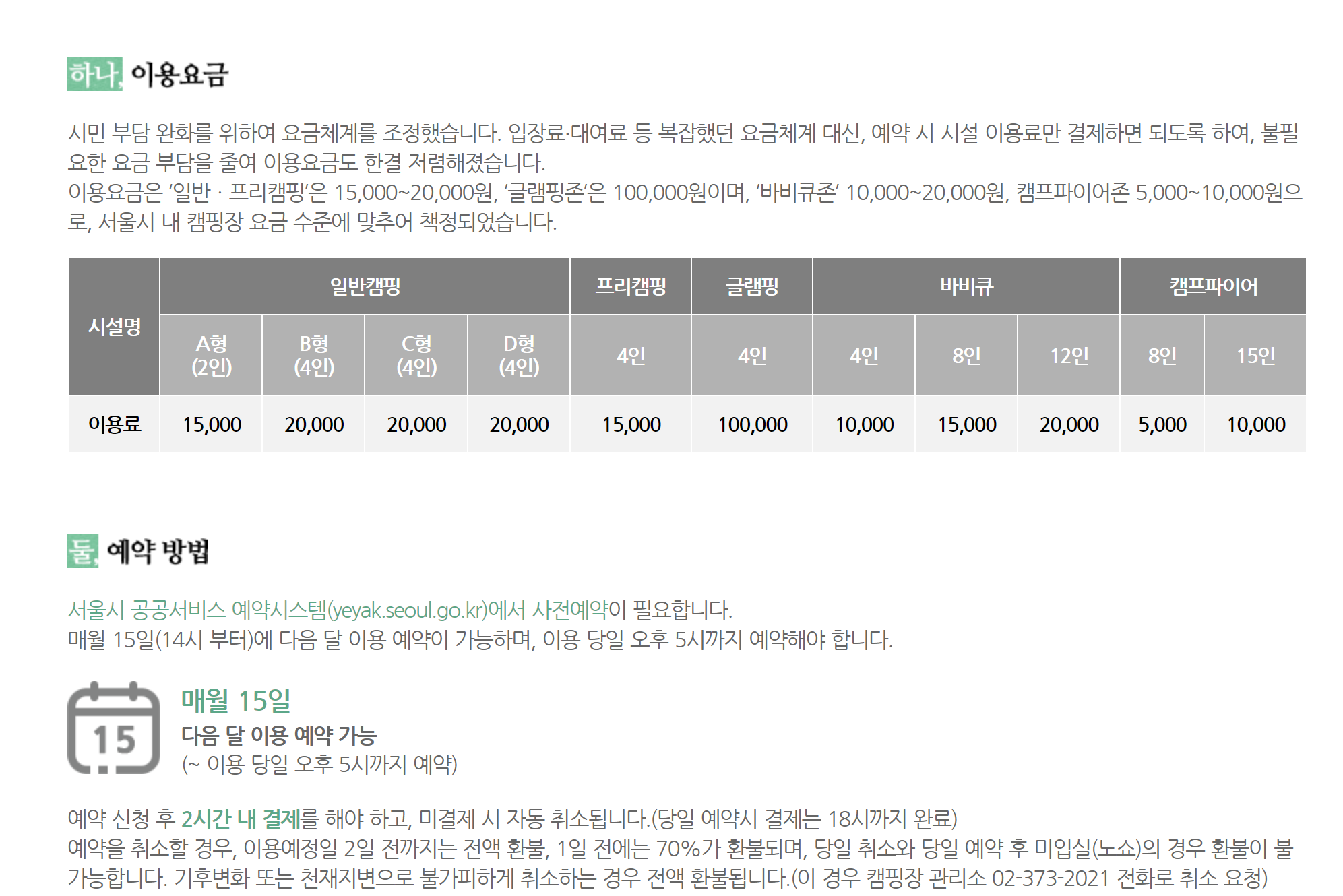 위 사이트에 들어가서 마포구, 캠핑장을 선택하면 예약이 가능하다.